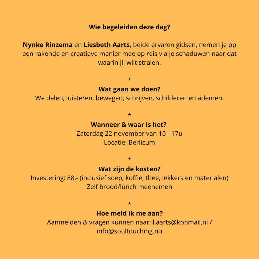 App/bel 06 1717 5765 of mail me via l.aarts@kpnmail.nl voor de mogelijkheden - 20 december Stilte-avond (19-21u) in het coachhuisje: samen terugblikken, stilstaan en verstillen in deze donkerste dagen van het jaar